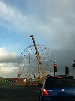 The RISE sculpture was designed by Wolfgang Buttress and consists of a geodesic sphere suspended inside a larger, 30 m (98 ft) diameter sphere, standing at an overall height of 37.5 m (123 ft).[5] Geodesic refers to the shortest path between two points on a curve so that in the case of the RISE sculpture, adjacent connections on each of the spheres are connected using straight bars, thereby minimising the distance between two points.[5] At 30m wide and 37.5m tall, RISE is the biggest public art sculpture in Belfast.[6]