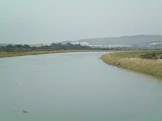 The Ouse (/z/ OOZ) is a 35 miles (56 kilometres) long river[1] in the English counties of West and East Sussex. It rises near Lower Beeding in West Sussex, and flows eastwards and then southwards to reach the sea at Newhaven. It skirts Haywards Heath and passes through Lewes. It forms the main spine of an extensive network of smaller streams, of which the River Uck is the main tributary. As it nears the coast it passes through the Lewes and Laughton Levels, an area of flat, low-lying land that borders the river and another tributary, the Glynde Reach. It was a large tidal inlet at the time of the Domesday Book in 1086, but over the following centuries, some attempts were made to reclaim some of the valley floor for agriculture, by building embankments, but the drainage was hampered by the buildup of a large shingle bar which formed across the mouth of the river by longshore drift.