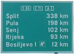 Croatian signs use the Hrvatsko cestovno pismo (lit.'Croatian road font') for the text on their signs, derived from the SNV typeface.[1]