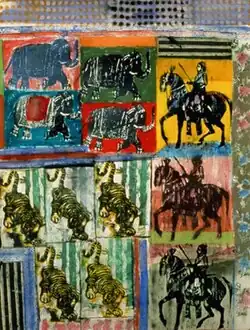 Brokl's later printmaking—like his painting—explores travel, animals and pets, and art itself and often combines woodblock printing, drawing, collage, painting and stencils (e.g., 9 Roosters, 2004; Weller Frog and Albers Painting, 2011; or David, 1992).[3][27][46][47][13] India XIII (1996) offers a characteristic work in this vein, with a layered, gridded format combining expressive gesture and crudeness in its repeated tiger, rider and elephant images and delicacy in its flower, rabbit and abstract woodblock patterns created with Indian fabric printing blocks.[48]