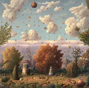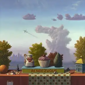 In later exhibitions, such as "Near and Far" (Tasende Gallery, 2005), Cocke demonstrated a complex use of space and scale, combining grand vistas and intimate details in small (5" tall by two feet) paintings that reviews noted for a surprisingly operatic and expansive effect despite their size.[26][1][27] During this period, Cocke reintroduced signs of human presence into his landscapes—usually unconventional objects (antique toys, stones, seedpods, keys, penny banks, lipsticks) in enigmatic, stream-of-conscious arrangements that sat in tension with their natural settings.[3][27] In these paintings, such as Once Upon a Time (2008), he sought to evoke non-explicit associations, relationships and narratives in viewers, akin to poetry.[3][28] His later paintings (e.g., Rendezvous, 2016) often depict miniature worlds or forlorn tableaus set against distant cities, landscapes or figures, which critics suggested evoke tender sadness or resignation, relieved by the freedom conveyed by vast skies.[29][30]