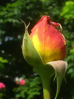 'Mme A. Meilland' forms elegant buds that open to large, cupped flowers with a high-centered form and an average diameter of 15 cm (5.9 in). Their color is a combination of pale yellow and crimson edges that depends on the location, the weather and changes as the flower fades. The durable flowers are very full, with 40 to 43 petals, survive rainy periods, and have a sweet and fruity fragrance that varies in its strength from mild to strong.[3] The cultivar flowers continuously throughout the season up to the first frost.