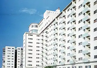 The apartments on the lower 10 floors have a living room, kitchenette, and a balcony on the north side units, and strip windows overlooking Miramar's first avenue.[13] The elevations are composed of a modernist curtain wall, its north side facing the sea contains a balcony between apartments that are shared by the units; there are six lines of balconies, the two lines furthest to the east serve single apartments. As opposed to the south elevation which contains strip windows spanning the entire length of the facade, the north elevation, as does the east elevation, has rectangular windows.