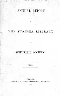 • The Annual Report of the Swansea Literary and Scientific Society: an annual magazine first published by 'Swansea Literary and Scientific Society' in 1850. In addition to reports on the society's activities it contained articles on scientific subjects, history, and antiquarianism.[28]