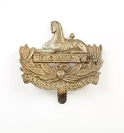 Meanwhile there had been a flood of recruits for 'Kitchener's Army', and Col William E.P. Burges, retired from the 3rd Bn, was appointed Temporary Lt-Col to command the 12th (Service) Battalion, Gloucestershire Regiment (Bristol's Own). He trained the battalion assiduously, but when it was ready to be sent to join the BEF he was considered too old for active service at the age of 59 and was ordered to relinquish command in August 1915.[69][70][71][72] However, after the war he was appointed Honorary Colonel of the 3rd Battalion.[46][62] The 11th (Reserve) Battalion (see below) was formed alongside the 3rd Bn at Abbey Wood in October 1914 to provide reinforcements for the Kitchener battalions of the Glosters.[18][66][68]