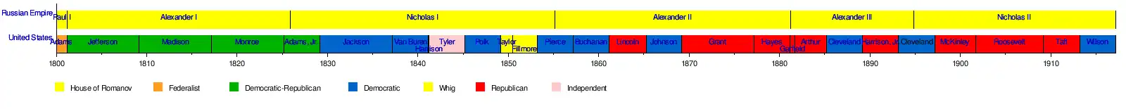 John AdamsThomas JeffersonJames MadisonJames MonroeJohn Quincy AdamsAndrew JacksonMartin Van BurenWilliam Henry HarrisonJohn TylerJames K. PolkZachary TaylorMillard FillmoreFranklin PierceJames BuchananAbraham LincolnAndrew JohnsonUlysses S. GrantRutherford B. HayesJames A. GarfieldChester A. ArthurGrover ClevelandBenjamin HarrisonWilliam McKinleyTheodore RooseveltWilliam Howard TaftWoodrow WilsonPaul I of RussiaAlexander I of RussiaNicholas I of RussiaAlexander II of RussiaAlexander III of RussiaNicholas II of RussiaUnited StatesRussian Empire