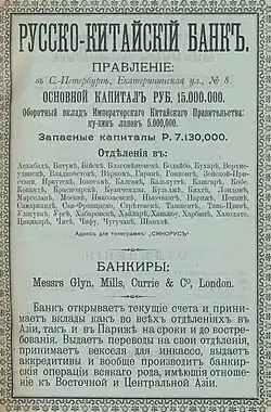 The bank immediately opened a branch in Shanghai in February 1896.[8] On 28 August 1896 it partnered with the Chinese imperial government for the construction of the Chinese Eastern Railway, acting as a conduit for project financing from the Russian government, and also receiving capital financing from the Chinese authorities - the only time ever that the Qing empire was involved in the capital of a foreign enterprise.[2] In Chinese, the bank was then referred to as "Sino-Russian Righteousness Victory Bank" (Traditional Chinese: 華俄道勝銀行).[9][8] By 1902, it had become the second-largest bank in China,[8] and the fifth-largest private-sector bank in the Russian Empire.[10]: 43  In 1898, the State Bank of the Russian Empire took a significant share of the bank's newly issued capital.[2] The Russian interests subsequently prevailed in the bank's management, and its French stakeholders were marginalized. The Russo-Chinese Bank's activity had initially been focused north of the Yangtze in order not to compete further south with the French-sponsored Banque de l'Indochine, but the bank breached that arrangement by opening a Hong Kong office in 1904.[6]