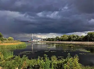 Rzhyshchiv River Port also called Rzhyshchivsky Port[3] is a port enterprise on the Dnieper River, and is located in the city of regional importance Rzhyshchiv. There is a coffee shop that was formerly a station building. Rzhyshchiv has always been considered one of the most important Dnieper ports, and by the middle of the 19th century the cargo turnover here was higher than in the Kyiv River Port and was second only to Dnipropetrovsk River Port (formerly called Katerynoslav). The river station here is typical of the 70s, but rare for small towns. The cargo port has cranes, handles sand, building materials,[2] and so on.