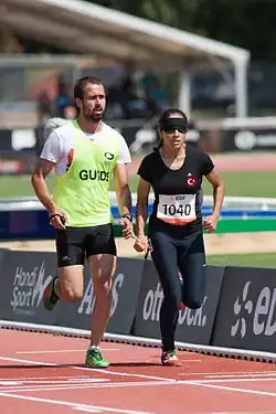 ![]() Sümeyye Özcan running with guide in the 1500m event at the 2013 IPC Athletics World Championships in Lyon, France. | ||||||||||||||||||||||||||||||
