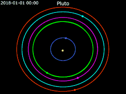 Observations indicate a circular, equatorial orbit around the Pluto-Charon barycenter at a distance of 57,783 km (35,905 mi).[4] All of Pluto's moons including Kerberos have very circular orbits with very low orbital inclinations to Pluto's equator. Kerberos orbits between Nix and Hydra and makes a complete orbit around Pluto roughly every 32.167 days.[1][16]