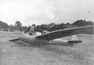 Construction was entirely of wood with fabric covering on the wings aft of the mainspar. The pilot and instructor sat in tandem, with the student forward of the wings and the instructor immediately aft of the mainspar in the wing centre-section. The seating arrangement allowed the aircraft to be flown with one or two pilots without the need for ballast to adjust the centre of gravity. A single mainwheel with nose and tailskids comprised the undercarriage, with the aircraft sitting nose down on the nose skid with the front cockpit occupied. Large DFS style airbrakes extended from upper and lower wing surfaces aft of the mainspars.