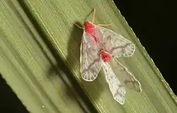 Saccharodite is a large genus of planthoppers from the family Derbidae, tribe Rhotanini, with more than 100 species. The largest number of species have been reported from Borneo, Indonesia, New Guinea and the Philippines, but the genus has a much wider distribution, ranging from Sri Lanka in the West, over southern parts of mainland Asia up to southern Japan in the North. Saccharodite is also found in other parts of the western Pacific like Micronesia, Fiji and New Caledonia, up to eastern parts of Australia, in the South as far as Tasmania. The adult hoppers are around 5 mm long from head to the tip of the forewings. They are characterized by their forewing venation. The forewings are usually glassy and bright red marks are common on the head and body, up to most parts except the wings being coloured bright red. When the insects are at rest, the wing surfaces form a common plane like in house flies.[2][3]