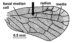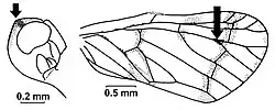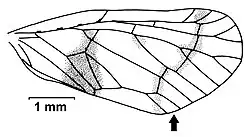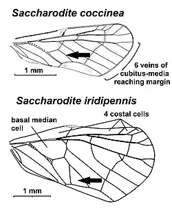More important for defining the genus are Fennah's illustrations of the forewing venation of his new species, especially a characteristic triangular cell close to the hind margin of the forewing which is marked by an arrow in the illustration of Saccharodite iridipennis on the left. Like in other genera of Rhotanini, the first branch of the media splits close to its base and the inner vein joins the branch of the cubitus to form the basal median cell. However, in Saccharodite, both veins separate again and then join once more, forming the characteristic triangular cell. Both veins fail to separate again in only a few species like in Saccharodite coccinea, see illustration on the left where the joined veins are marked by an arrow. There is another very small triangular cell at the base of the first branch of the media. The triangular cell near the hindwing of the forewing is unique in the tribe Rhotanini and is the main diagnostic character of the genus in combination with 2 other characters, the 4 costal cells and for most species the 6 veins of the cubitus-media complex reaching the margin at the end of the forewings.[3]