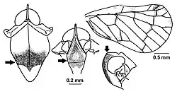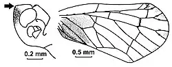 A total of 108 species of Saccharodite have been described (as of 2024) and 81 of these have been assigned to 9 species groups as they show obvious similarities in forewing venation, other morphological features and/or colouration.[3] For example, Saccharodite coccinea and Saccharodite sanguinea form one species group. Five other species groups are briefly described below and their main features are illustrated and marked by arrows: