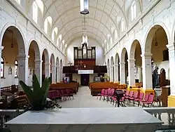 Music is an integral part of worship at Sacred Heart Church. The church's two-manual of eleven stops pipe organ, which was built by George Fincham & Son, in 1910.[4] The organ went through some minor modifications only for the wind system, everything else has remained the same since it was first built. The organ is located strategically at the centre, in the rear gallery, preserving its original tone scheme, tubular-pneumatic action, pipework, reversed console and unusual casework.[4]