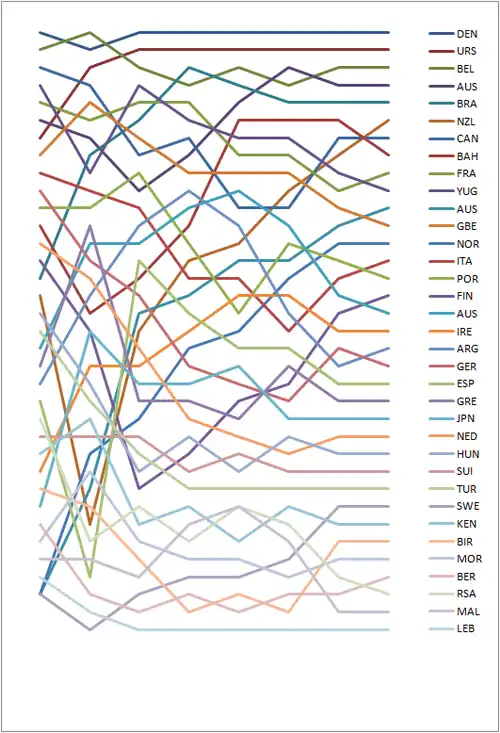 Graph showing the daily standings in the Finn during the 1960 Summer Olympics