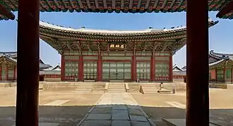 It was completed in 1395.[6][2] At the time, it was called "Bopyeongcheong" (보평청; 報平廳; Pop'yŏngch'ŏng), but soon afterwards it received its current name.[6] It was named by the Korean official Chŏng Tojŏn based on a quote from the Chinese text Book of Documents.[7] It was among the first structures in the palace.[8] It was expanded in 1429.[9][6][10] It was destroyed in the 1553 fire and rebuilt.[11][12][2] After being destroyed in 1592 during the Imjin War, it was rebuilt in 1867.[13][14][2] The building's exterior has since survived until the present, although its interior was modified when the building was used as an exhibit hall during the 1915 Chōsen Industrial Exhibition.[2] A wall mural in the building was removed in the early 2000s for the purpose of preservation and replaced with a replica.[5] The building has a counterpart entrance gate Sajeongmun (사정문; 思政門; Sajŏngmun) that was also rebuilt in 1867 and has remained to the present.[14][15]