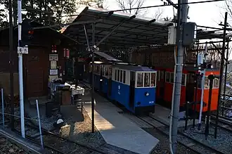 Kaze-No-Toge Station on the Sakuradani Light Railway in February 2013, with electric cars 1408 and 10 visible
