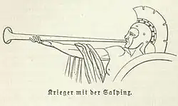When encountered in Greek art and literature, the salpinx is usually depicted as being played by a soldier. Fifth century authors frequently associated its "piercing sound" with war; the instrument often being used for signalling, summoning crowds and beginning chariot races.[11] This is supported in the writing of Aristotle who, in De audibilibus, explained that salpinges were used as "...instruments of summons in war, at the games, and so on, not to make music."[12] Aristides Quintilianus described the necessity of the salpinx and salpingtis (a player of the salpinx) in battle in his treatise, On Music. He explains that each command to troops was given using specific tones or "melodies" played on the salpinx. This action allowed for an entire army to receive a command at once as well as provide a level of secrecy as these salpinx calls were specific to a group and would be unknown to an opponent.[13] Yet despite its distinctive sound, the shrill blasts of the salpinx would have had a difficult time overcoming the clashing of metal, the cries of the wounded, the roars of aggression from rows of soldiers. This is why the salpinx was primarily used before battle to summon men to prepare for battle and to sound the charge.[14]