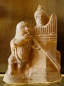 Andrew Barker, however, describes a possible exception to the utilitarian usage of the salpinx referencing Aristotle, who wrote, "...that is why everyone, when engaging in revelry, relaxes the tension of the breath in playing the salpinx, so as to make the sound as gentle as possible."[15][16] It is suggested here that the salpinx may have found use in festive occasions as well as war. This notion is corroborated by Nikos Xanthoulis in his article "The Salpinx in Greek Antiquity". Here, he draws particular attention to Aristotle's statement that "...participants of a komos unbend the tension of the exhaling air in the salpinx, in order to make the sound smoother." The komos, a street festival with music and dance, would require an "unbending of tension" in order to create a more pleasing tone thus indicating a usage for the instrument outside of the military.[17] Another more universal function of the salpinx was to use it as a means of bringing silence to a rambunctious crowd or at a large gathering. This was both useful in a societal setting in places such as large assemblies and as a tool to quiet soldiers while a general addressed his men.[18]
