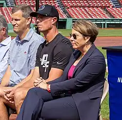 Kennedy sits alongside retired American football player Matt Ryan and Massachusetts governor Maura Healey at a 2024 event at Fenway Park