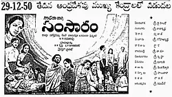 Samsaram (transl. Family) is a 1950 Indian Telugu-language drama film directed by L. V. Prasad. It stars N. T. Rama Rao, Akkineni Nageswara Rao and Lakshmirajyam, with music composed by Susarla Dakshinamurthi.[1] It was produced by K. V. Krishna and C. V. Ranganatha Dasu under the Sadhana Productions banner. The film was recorded as a Blockbuster at the box office. The film was later remade in Tamil with the same name, in Hindi as Sansar and in Malayalam as Ayodhya (1975).[2]