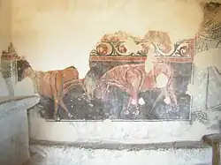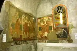 The hermitage housed many fine Romanesque frescoes from about 1125; most of these have been removed, but some have remained. Two sections, transferred to canvas, are now in the Indianapolis Museum of Art, showing the Entry of Christ into Jerusalem and the Wedding at Cana.[7] Other sections, including The Healing of the Blind Man and the Raising of Lazarus and The Temptation of Christ are in the Metropolitan Museum of Art in New York,[8] and in the Prado. The paintings are considered the work of three anonymous local artists. All decorative motifs on arches and vaults, as well as the large biblical scenes and the paintings on the apse, are attributed to the Master of Maderuelos, or First Master of Casillas. The hunting scenes of the lower areas, which are the most original, are attributed to the Master of San Baudelio. A third master of more modest proficiency is considered the author of the paintings inside the choir. [The paintings were done by the Catalan Master of Tahull (Taüll in Catalan), whose best known works are in Sant Climent de Taüll and the Museu Nacional d'Art de Catalunya in Barcelona,[9] with two other painters.]? The scenes of the Life of Christ are unusual in Spanish painting at this period; these are in American museums, while smaller elements including scenes of hunting and falconry and decorative copies of textiles are in Madrid as well as New York.[10] The frescoes include that of a camel and of a war elephant, which were inspired by Muslim motifs.[1]