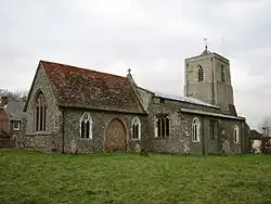 The parish church of All Saints was rebuilt in phases from the mid-14th century. The earliest surviving fabric in the current building is the chancel, which is known to have been rebuilt around 1348; the nave was subsequently rebuilt around the 1360s and the tower and porch were added around 1400. Substantial brick buttresses were added to the tower for support in the 17th century.[6][4]