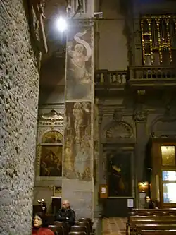 The interior is simple with a nave and two aisles, ogival arches and groin vaults.[1] Artworks include frescoes by Bernardino Poccetti (Histories of St. Zenobius in the vault), a Nativity by Matteo Rosselli, and, above the altar of the left transept chapel, a polychromed stucco relief panel, the Madonna del Carmelo, long attributed to the 13th century artist, Coppo di Marcovaldo. A recent restoration has caused scholars to question this attribution and posit an earlier, 12th century date for the panel.[2] The same chapel houses the tomb of Brunetto Latini, discovered in 1751, and a sarcophagus attributed to Tino di Camaino (early 14th century).