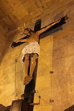 The Santo Cristo image, its feet encased in glass, in the Calvario above the main altar