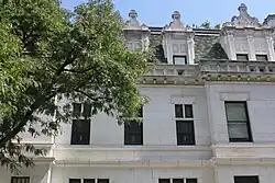 The exterior is built completely of white Vermont marble, structurally and aesthetically. The roof is a mansard terra cotta and green tile with steel girders and copper cornices.[5] The construction manager of the mansion, Charles T. Willis, predicted the house would cost $180,000 to build, and he was right. The mansion completed construction one year after it began in 1909.[3] The mansion has decorative motifs such as pineapple motifs, seen as a symbol of hospitality; there was originally a tunnel, now closed up, that led under ground to the Hudson River.[3]