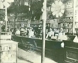 1895 photograph of the interior of the Schwegmann Grocery Store at the corner of Piety Street and Burgundy Street in New Orleans. Garret Jr. is at the far right and John Schwegmann Sr. is second from left.
