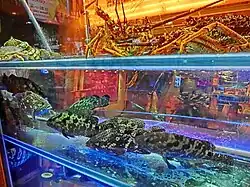 A seafood restaurant is a restaurant that specializes in seafood cuisine and seafood dishes, such as fish and shellfish. Dishes may include freshwater fish. The concept may focus upon the preparation and service of fresh seafood,[1] (as opposed to frozen products). Some seafood restaurants also provide retail sales of seafood that consumers take home to prepare.[1] Seafood restaurants may have a marine-themed decor, with decorations such as fish nets, nautical images and buoys.[1][2] Fare can vary due to seasonality in fish availability and in the fishing industry.[2][3] Seafood restaurants may offer additional non-seafood items, such as chicken and beef dishes.[2][4]
