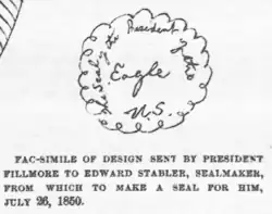 The documented history begins in 1850, when a seal was made after a crude drawing submitted by Millard Fillmore. It depicted an eagle "displayed with wings inverted", i.e. with its wingtips down, holding an olive branch and three arrows in its talons. The shield is essentially the same as the Great Seal, with a blue chief and red and white stripes and the eagle facing to its right, though there were nineteen stripes and the outermost stripes were red, both unlike the Great Seal. Thirty-one stars were distributed above and around the eagle, indicating that the seal dates from after when California became the 31st state in September 1850. It was made by Edward Stabler, a farmer and postmaster in Sandy Spring, Maryland, who had earlier made seals for the Senate, House of Representatives, and several government departments.[15][16] Stabler had also made a seal for the Vice President in 1846, and the correspondence surrounding it indicated that even earlier vice-presidential seals existed, so presumably earlier presidential seals existed as well.[17] The president's seal was described by Benson Lossing in 1856 as "round, with an eagle upon it" (contrasting it to the seal used during the Continental Congress).[10]