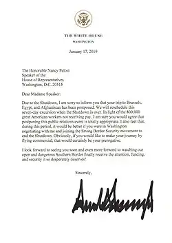 2018 letter from President Donald Trump to House Speaker Nancy Pelosi, formally decorated with the presidential seal