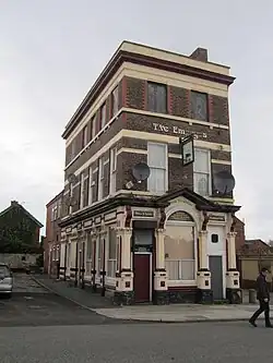The LP cover consisted of a photograph by Richard Polak, showing the Empress pub in Dingle,[73] the area of Liverpool where Starr grew up.[74] The Empress was his local pub as a young man;[75] according to author Alan Clayson, in past decades, all of the album's standards would have been sung by happy patrons in the bar there.[15][nb 9] A photo of Starr dressed in a tuxedo was superimposed so that he appears to be standing at the door to the pub. The figures in the windows are his relatives,[76] superimposed from family photos.[61][nb 10] The back cover had a photo of Starr in casual clothing, standing outside a building and gesturing towards the wall. The track listing, with the name of each arranger, and other album credits appear in white as if printed on the wall.[61]