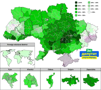 In the 2020 Ukrainian local elections, the party won more seats than the other parties participating, 17.59% of local seats were won by the party.[41] In total, the party nominated more than 23,000 candidates for local councils.[42] Observers pointed out that the party (as other national parties) did suffer setbacks in Ukraine's largest cities across the country, including the capital Kyiv.[43][44] In Kyiv, the party's mayoral candidate Iryna Vereshchuk and the party itself finished in fifth place.[45][46] This was despite the fact that in the 2019 parliamentary election Servant of the People was the most popular party among Kyivites with 36.46%.[47] 225 Servant of the People candidates (30.74% of all elected mayors nominated by a political party) were elected village, town or city mayors.[48] Independent candidates won 661 mayoral elections.[48] Although the party had not allowed incumbent MPs but only "new ambitious politicians" to be their candidate in the 2019 parliamentary election,[25] in the 2020 Ukrainian local elections Servant of the People candidates were incumbent mayors and local council members and (other) former members of Party of Regions, Batkivshchyna, Petro Poroshenko Bloc and other political parties.[49] In elections held in places with a population of less than 10,000 voters, the party won two seats.[50]