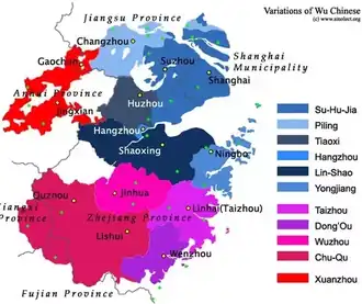 Wu language, also known as Jiang Nan, Wu Yue, Jiang Dong language. Three thousand years of history from the Zhou Dynasty. In China, Wu language are distributing in Zhejiang, southern part of Jiangsu, Shanghai, southern part of Anhui and Fujian province. The population who use this language is about ninety million.