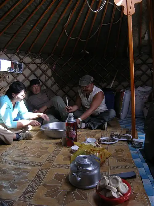 Two contrasting sheets of vinyl flooring used in a food-preparation area in a Mongolian ger (yurt). Stove on the right.