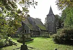 Shelley parish was in the Ongar Union – poor relief provision set up under the Poor Law Amendment Act 1834 – and in the Ongar Rural Deanery, of the Essex Archdeaconry of the Diocese of St Albans. In 1888 St Peter's Church was entirely rebuilt on same site in Early English style with flint and Bath stone. The new, and existing, church has a nave of three bays, a north aisle, a vestry and an organ chamber. The tower, with shingle broach spire, and containing two bells dating to 1810, is built at the north west corner of the church, the base of the tower forming the north facing porch. During digging the foundations for new church, two tombstones, dated 1652 and 1765, were discovered and were built into the west wall of the porch. The present church is Grade II listed.[10] During at least the last half of the 19th and into the 20th century, children at Shelley were entitled to attend school at Chipping Ongar. Attached to Shelley Hall was a room which housed the parish Sunday School, which in 1894 was being taught by the occupant of the Hall and the daughters of the rector.[6] In 1818 education for the poor had been provided by a Sunday School in Ongar and a nearby day school, paid for through a subscription from the rector.[11] The rector's later Sunday School at Shelley, begun in 1828, was attended by nine males and eight females.[12]