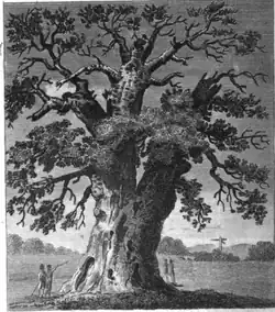 During the early 19th-century a plaque was erected at the site that read: "On July XXII AD MCCCCIIII OWEN GLENDWR ascended this Tree to reconnoitre, on his march to Shrewsbury, to join the daring Hotspur, against King Henry IV; but, finding his friends were defeated, returned from this spot into Wales" (the date and year stated here, 22 July 1404, are not those of the actual battle).[7] The tree was also known at this time as "Owen Glendwr's Observatory" and the "Glendower Oak" due to its association with the legend.[5][7] An acorn from the tree was planted by the gate of Pentreheylin Hall by a Mrs Croxon in 1832 and was flourishing more than 40 years later. A report from 1878 suggests that the hollow trunk of the Shelton Oak was by then large enough for eight people to dance a quadrille within it.[8] A second acorn from the tree was grown into a sapling and planted at The Elms in Shrewsbury by Dr Charles Waring Saxton on 5 February 1880.[5]