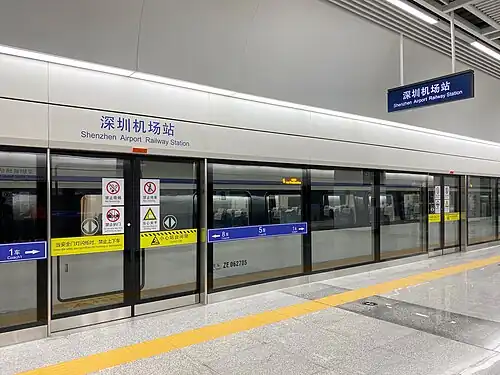 Shenzhen Airport railway station (simplified Chinese: 深圳机场站; traditional Chinese: 深圳機場站; pinyin: Shēnzhèn Jīcháng Zhàn; Jyutping: Sam1zan3 Gei1coeng4 Zaam6) is a railway station underneath Terminal T3 of Shenzhen Bao'an International Airport in Bao'an District, Shenzhen, Guangdong, China. It opened on 15 December 2019, and is the current southern terminus of the line.[1][2]