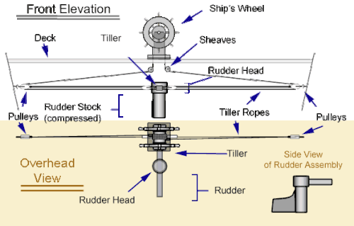 Diagram of the steering gear of an 18th- to 19th-century sailing ship[3]: 151