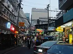 Si Lom Road (also written as Silom, Thai: สีลม, pronounced [sǐː lōm]) is a major street in Bangkok, Thailand. The road is best known for its commerecial neighbourhood, which, along with the nearby and roughly parallel Sathon Road, forms one of the city's main business districts. It runs in a southwest–northeast direction between Charoen Krung and Rama IV roads in the city's Bang Rak District, forming the boundary between Suriyawong Subdistrict to its north and Si Lom Subdistrict to its south. Si Lom was one of the earliest modern roads to be built in the city, and some of its side streets serve historic ethnic neighbourhoods from the late nineteenth century, while others are known as shopping and nightlife venues.