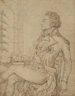 Smith specialised in inshore operations, and on 19 April 1796, he and his secretary John Wesley Wright were captured while attempting to cut out a French ship in Le Havre. Smith had taken the ship's boats into the harbour, but the wind died as they attempted to leave the harbour, and the French were able to recapture the ship with Smith and Wright aboard. Instead of being exchanged, as was the custom, Smith and Wright were taken to the Temple prison in Paris where Smith was to be charged with arson for his burning of the fleet at Toulon. As Smith had been on half pay at the time, the French considered that he was not an official combatant. Whilst in the Temple prison he commissioned a drawing of himself and his secretary John Wesley Wright from the French artist Philippe-Auguste Hennequin, which is now in the British Museum.[4] Another drawing by Hennequin, depicting only Smith, is in the Metropolitan Museum of Art.[5]