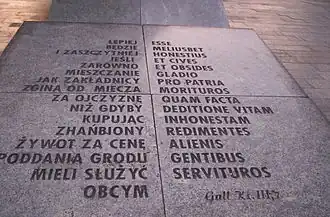 Inscription citing Gallus Anonymus: "It is better and more honourable if the citizens as well as the hostages die by the sword for the fatherland than by submission pay for a dishonourable life as slaves of alien masters."