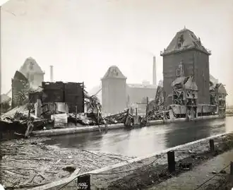 On 19 January, a fire broke out in the melt-pot room, and efforts to put it out were underway when approximately 50 long tons (50 tonnes) of trinitrotoluene (TNT) ignited at 6:52 p.m. The TNT plant was destroyed instantly, as were many nearby buildings, including Silvertown Fire Station. Much of the TNT was in railway goods wagons awaiting transport.[4] Debris was strewn for miles around, with red-hot chunks of rubble causing fires. A gas holder was damaged on Greenwich Peninsula, creating a fireball from 200,000 cubic metres (7.1 million cubic feet) of gas; the holder was later repaired and remained until 1986. Several thousand pounds' worth of goods were also destroyed in nearby warehouses, estimated by the Port of London Authority to cover 7 hectares (17 acres).[5] The chancel and church hall of the local church, St Barnabas', were destroyed, being replaced only in 1926.[6]