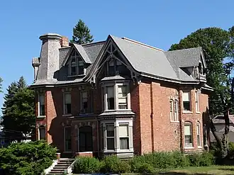 The house is a three-story brick structure measuring approximately fifty feet by sixty-two feet. The roof is a combination of gable and mansard types, and the entire house is somewhat asymmetrical, exhibiting an eclectic combination of High Victorian architectural styles, including Stick, Eastlake, and Second Empire. Two-story bay windows are located on three facades, and a three-story octagonal tower penetrates the roofline. The front entryway contains an elaborate pair of arched double doors.[2]