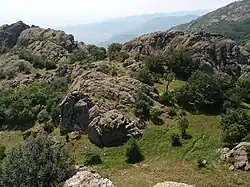 Due to the complex geological composition, the relief is highly dissected. Its lowest point is at an altitude of about 290 m; the highest point of is the summit of Bulgarka (1181 m), which is also the highest peak in the eastern Balkan Mountains.[2][4] The elevation increases northwards, with the northern section of the park being the highest, where the main ridge of the Sliven Mountain is located. The northern slopes of the mountain are very steep and difficult to access, and are covered with extensive beech forests. The southern reaches of the park are occupied by ravines and crevices with sparse vegetation, represented mainly by individual trees.[7] There are numerous caves, such as Zmeevi Dupki, Haydushkata Peshtera, Bachvata, Starite Dupki, etc.[2]