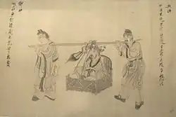 As is traditionally depicted, the group wished to escape the intrigues, corruption and stifling atmosphere of court life during the tail end of the politically fraught Three Kingdoms period of Chinese history and into the early period of the newly established Jin dynasty. According to tradition, the members, Liu Ling (221–300), Ruan Ji (210–263), Ruan Xian (fl. 3rd century), Xiang Xiu, Wang Rong (234–305) and Shan Tao (205–283) gathered in a bamboo grove near the house of Xi Kang (aka Ji Kang) (223–262), in Shanyang (now in Henan province) where they enjoyed, and praised in their works, the simple, rustic life. Modern criticism suggests that these gatherings may have been to some extent virtual. Either way, this way of living was contrasted with the life of politics at court. The Seven Sages stressed the enjoyment of ale, personal freedom, spontaneity and a celebration of nature. The various 7 sages had their own specialties. However, they shared philosophical discussion, musical production, and drinking.[5] Burton Watson considers Ruan Ji (whose name he transcribes as Juan Chi) to be the "first important poet" following the Jian'an poetry style.[6] Ruan Ji helped to define the Six Dynasties poetic development of the themes of reclusion and friendship.[7] He helped to develop the five-character shi poetry form which had just newly developed with the Jian'an poets, but he moved it away from its initial starkly realistic descriptions of particular scenes which could be right before the poets' eyes towards more generalized, abstract, and symbolic poetic statement. Ruan Ji also developed the nature theme, focusing on "the passing of time and the cycle of the seasons", which lead towards the death of the individual. Ruan Ji was also used to deploy the imagery of birds as symbols of freedom and ability to escape their given situation. Burton Watson further notes the evident lack of the imagery of wine in Ruan's surviving poems. Not that he was unacquainted with it, even recorded as having remained continuously drunk for 2 months to avoid an undesirable marriage which was urged upon him with great political pressure such that he could not overtly refuse.[8]